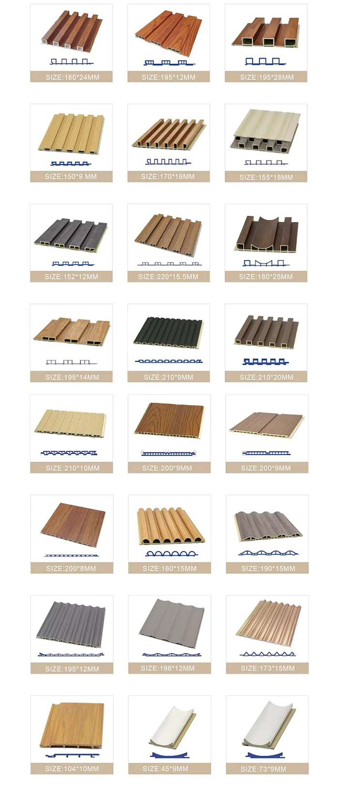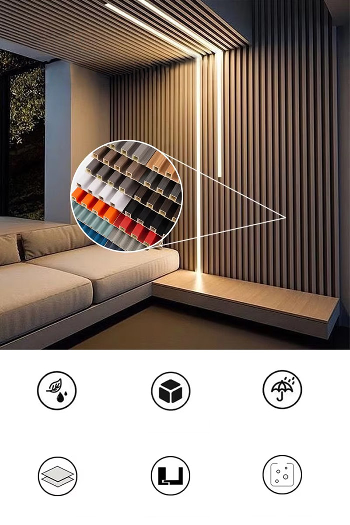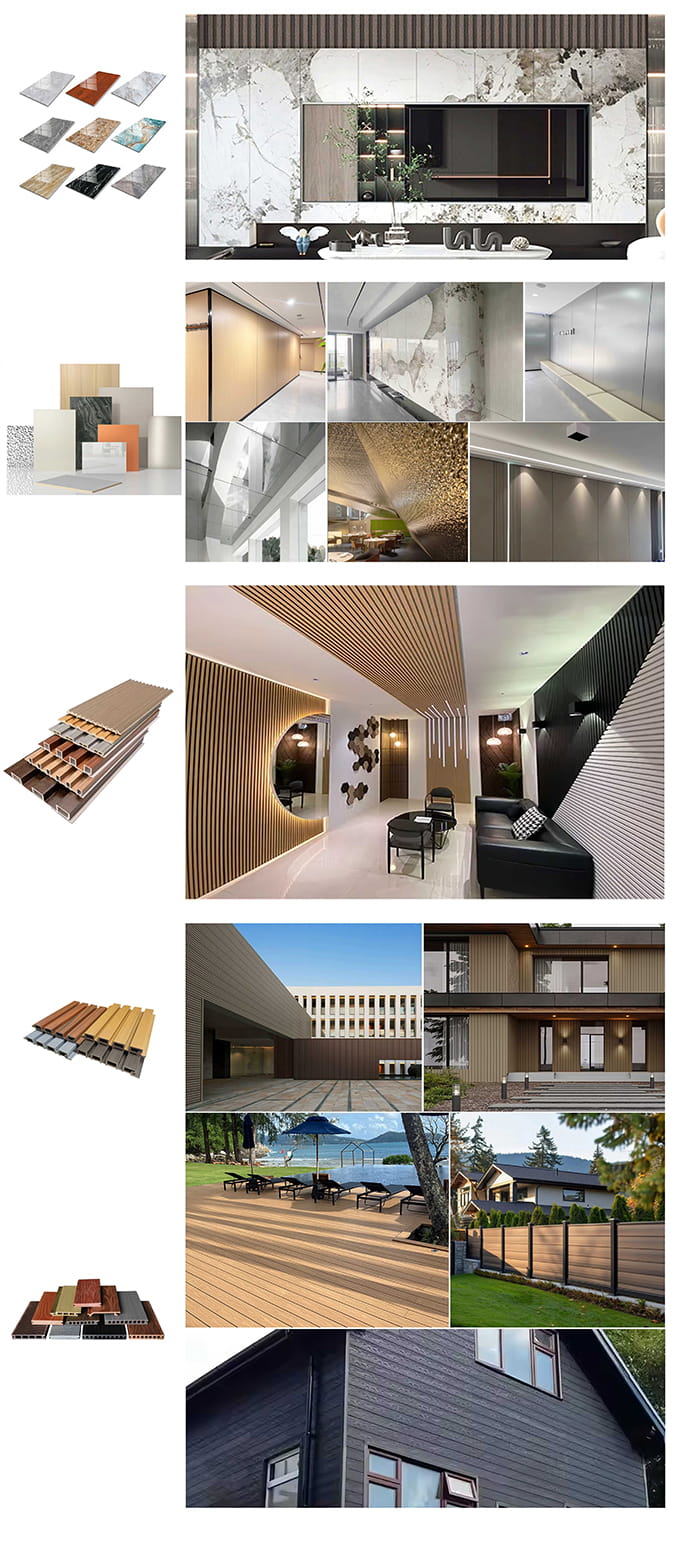 Vnitřní panely WPC jsou nové ekologicky šetrné dekorativní panely vyrobené z dřevěných vláken nebo bambusových vláken jako základní suroviny, smíchané s PVC pryskyřicí, práškem uhličitanu vápenatého a stabilizátorem prostřednictvím vysokoteplotního a vysokotlakého procesu. Povrch využívá UV povlak nebo vysoce přesnou přenosovou technologii pro simulaci textury přírodního dřeva a kamene a má vlastnosti vodotěsné a odolné proti vlhkosti, odolné proti plísním a antibakteriální, nízkou hmotnost a vysokou pevnost. Je vhodný pro vnitřní stěny, stropy, stěny na pozadí a další scény a je ideální volbou pro nahrazení tradičních dřevěných dýh a plastových klínků.