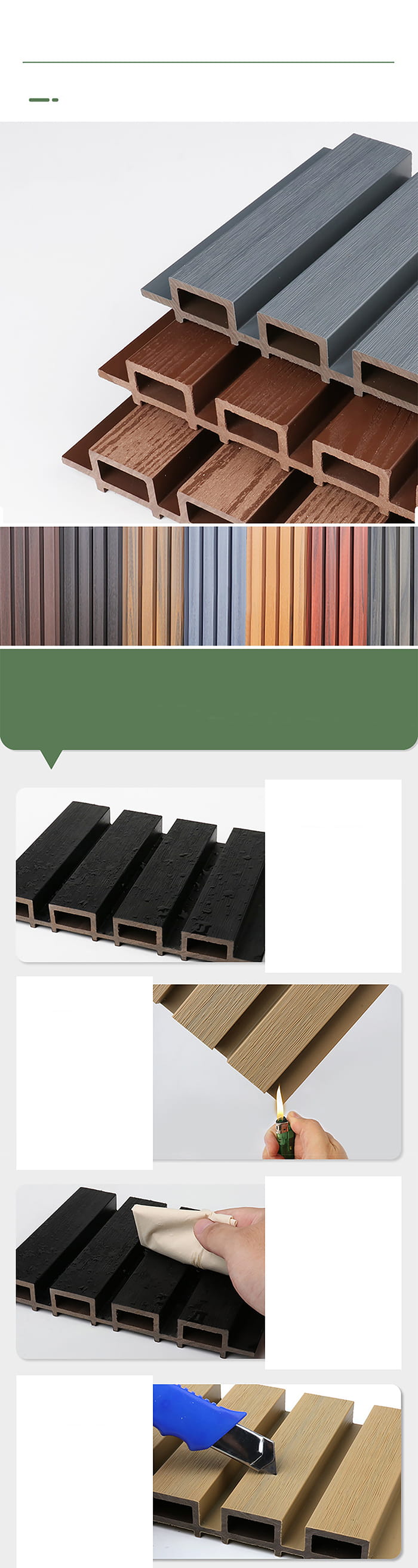 Kontrola kvality: Během výrobního procesu jsou venkovní panely WPC přísně kontrolovány z hlediska kvality, včetně rozměrové přesnosti, rovinnosti, hustoty, požární odolnosti, ochrany životního prostředí atd.