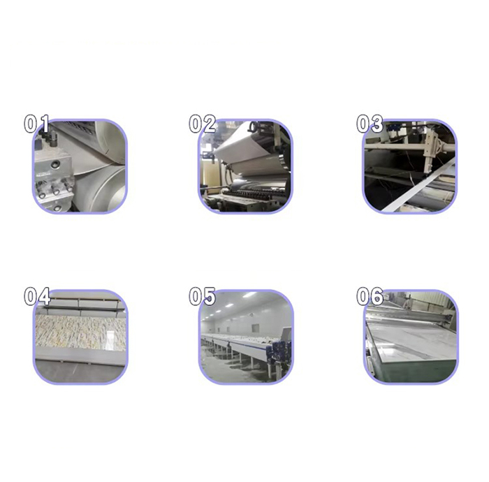Výrobní proces: Po smíchání prášku z PVC pryskyřice s přísadami se vyrábí vysokorychlostním mícháním, nízkorychlostním mícháním za studena, kónické dvoušnekové vytlačování, tvarování v matrici (koextruzní pěnění), chlazení a tvarování, víceválcová trakce a řezání produktu. Po nanesení UV barvy je vytvrzena UV světlem, aby byla zajištěna jednotnost a tvrdost nátěrového filmu.
