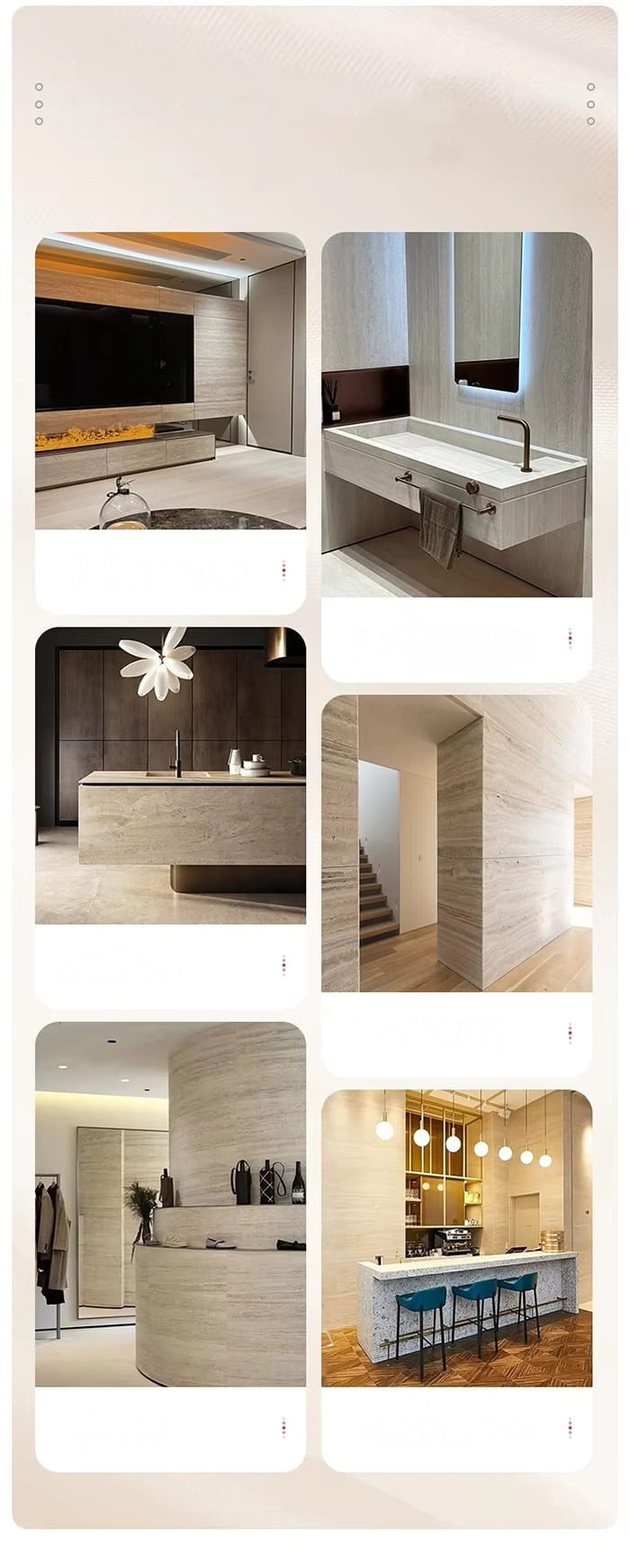 Vnitřní stěny budovy: Lze použít k dekoraci vnitřních stěn rezidencí, kanceláří, hotelů, nákupních center, škol, nemocnic, kancelářských budov, vil, luxusních komunit atd., jako jsou stěny na pozadí, kuchyně, koupelny a další prostory.